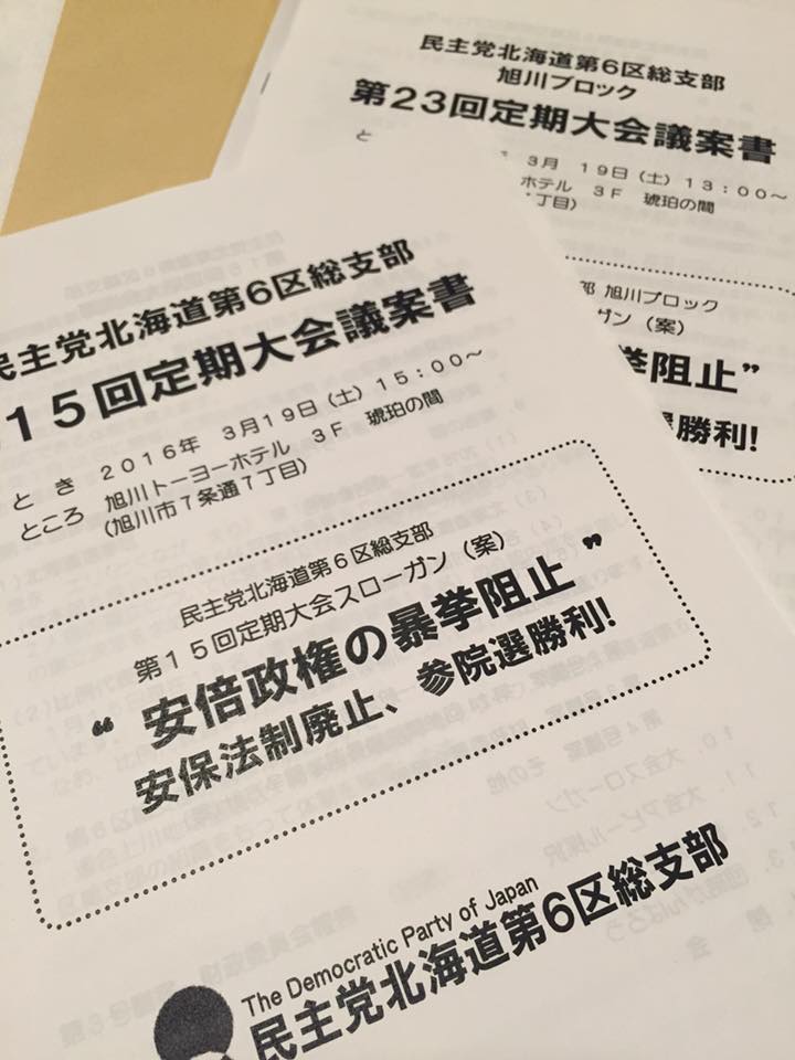3月19日、13時より民主党北海道旭川ブロック定期大会を皮切りに、民主党北海道第六区総支部定期大会、そして最後は民主党北海道上川ブロック合同選挙対策本部発足総会を開催しました。